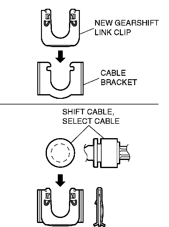 CAUTION: Insert thoroughly the gearshift link clip, shift cable and select cable until they click in place.