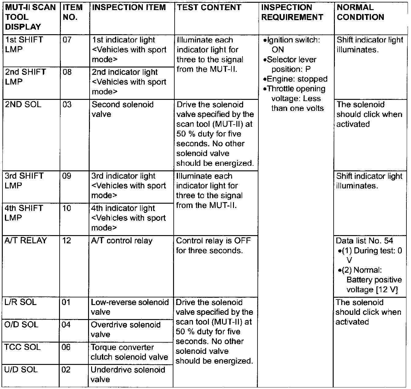 Actuator Test Reference Table