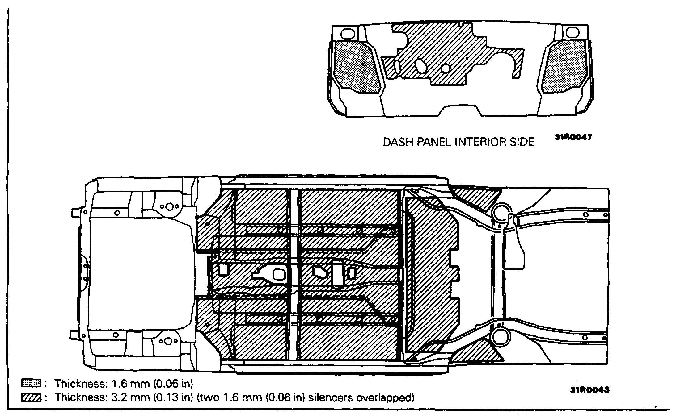ATTACHMENT OF SILENCERSSilencers (petroleum-asphalt sheets) are attached to the upper surface of the floor and at the interior side of the dash panel in order to absorb vibrations and shut out exhaust gas heat. If these silencers are peeled off in the course of replacement or repair of a welded panel, cut and attach replacement materia (in the shape shown in the figure). For detailed information concerning the locations where silencers are to be attached for individual models, refer to the manual for that model.