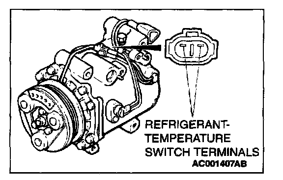 When the A/C is off, check that there is continuity between the refrigerant-temperature switch terminals. If not, replace the switch.