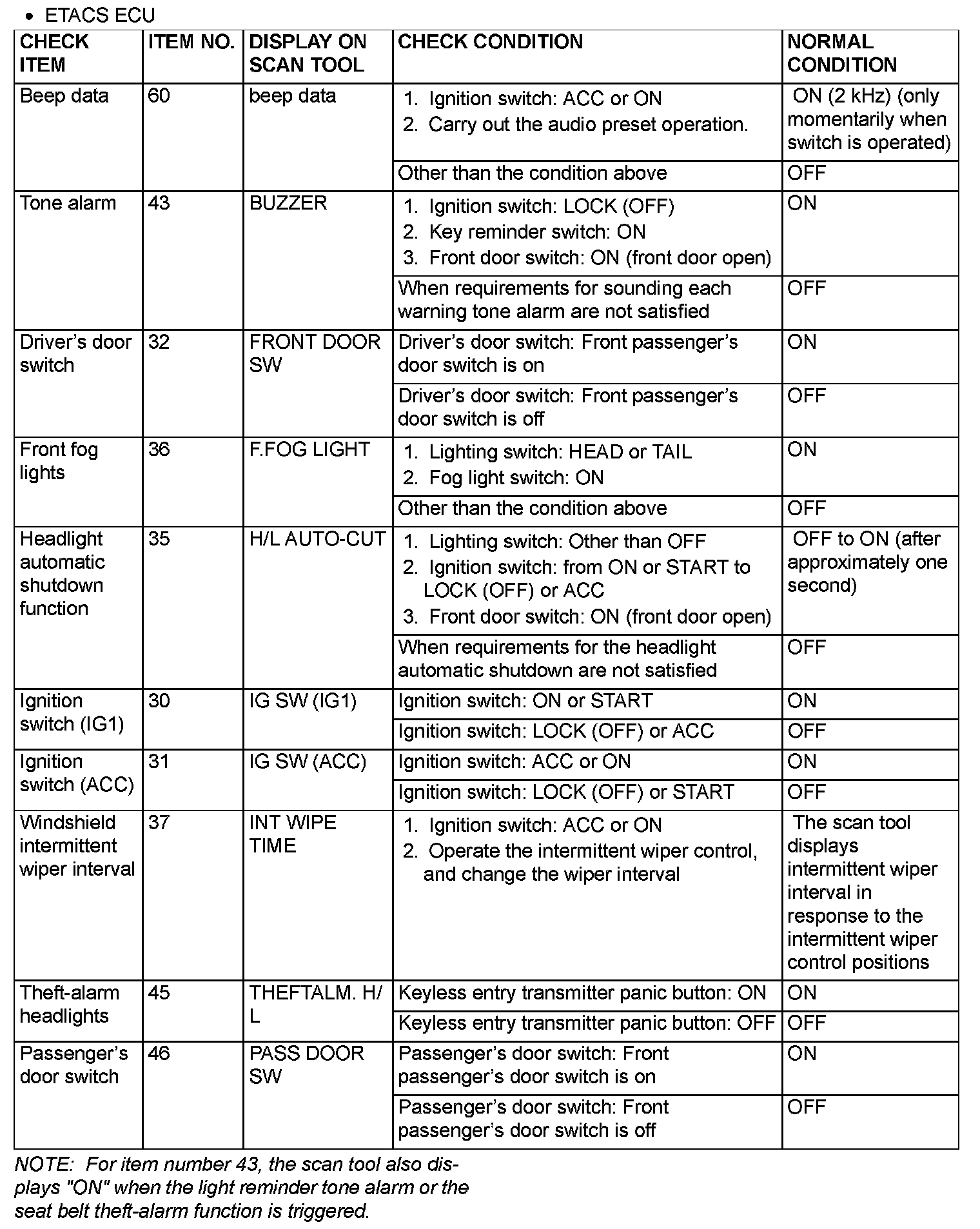 The table below shows the service data and their normal condition, which are displayed during the "DATA LIST."