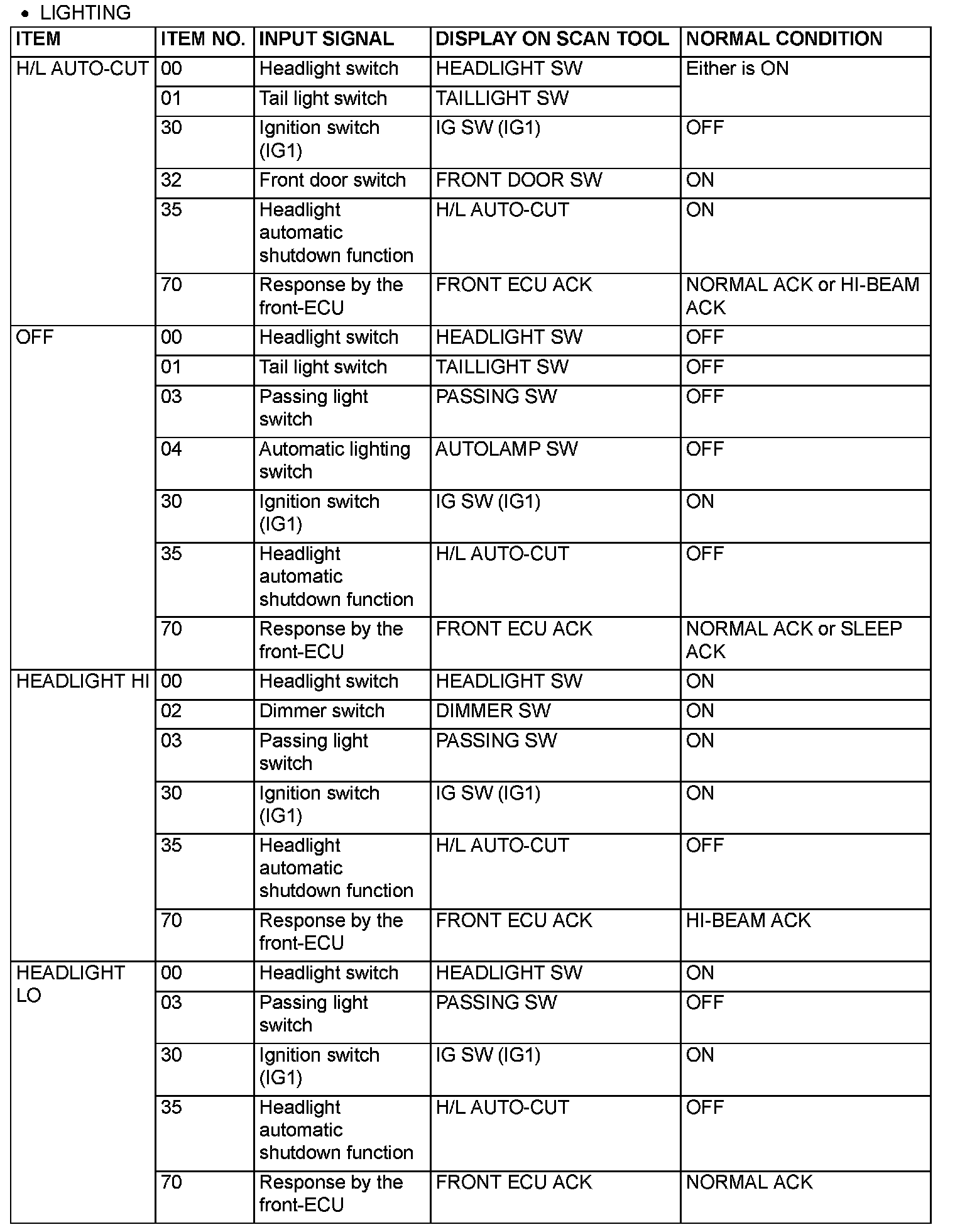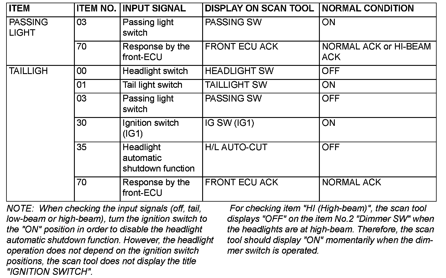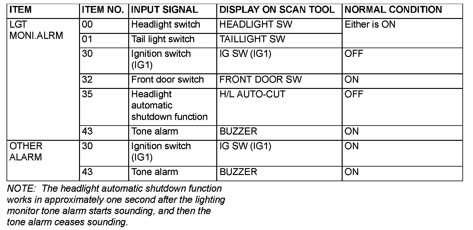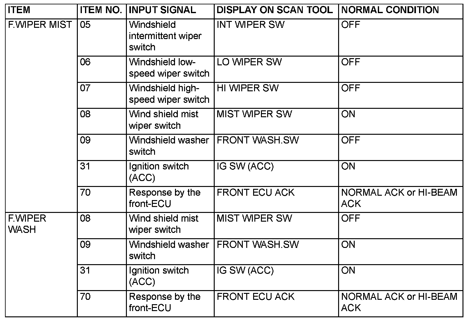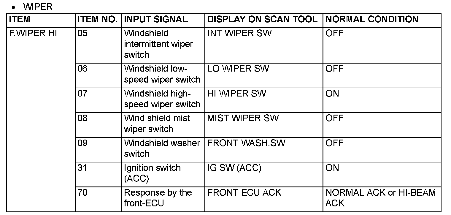 The table below shows the service data and their normal condition, which are displayed during the "FUNCTION DIAG." The row "Normal conditions" shows values, which are shown when each operation is made.