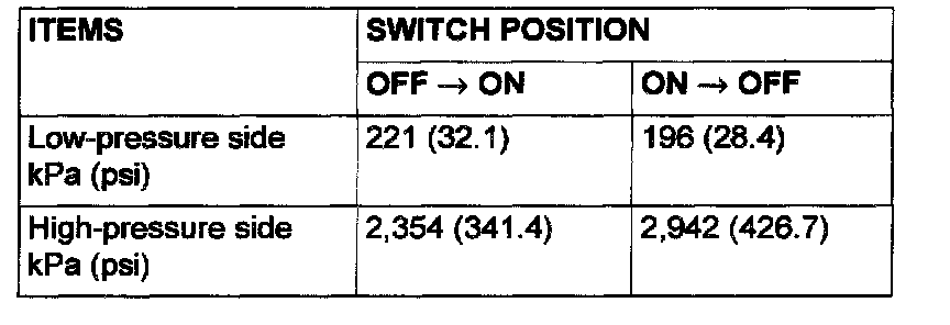 3. When the high/low pressure sides of the dual pressure switch are at operation pressure (ON) and there is continuity between the respective terminals, then the condition is normal. If there is no continuity, replace the switch.
