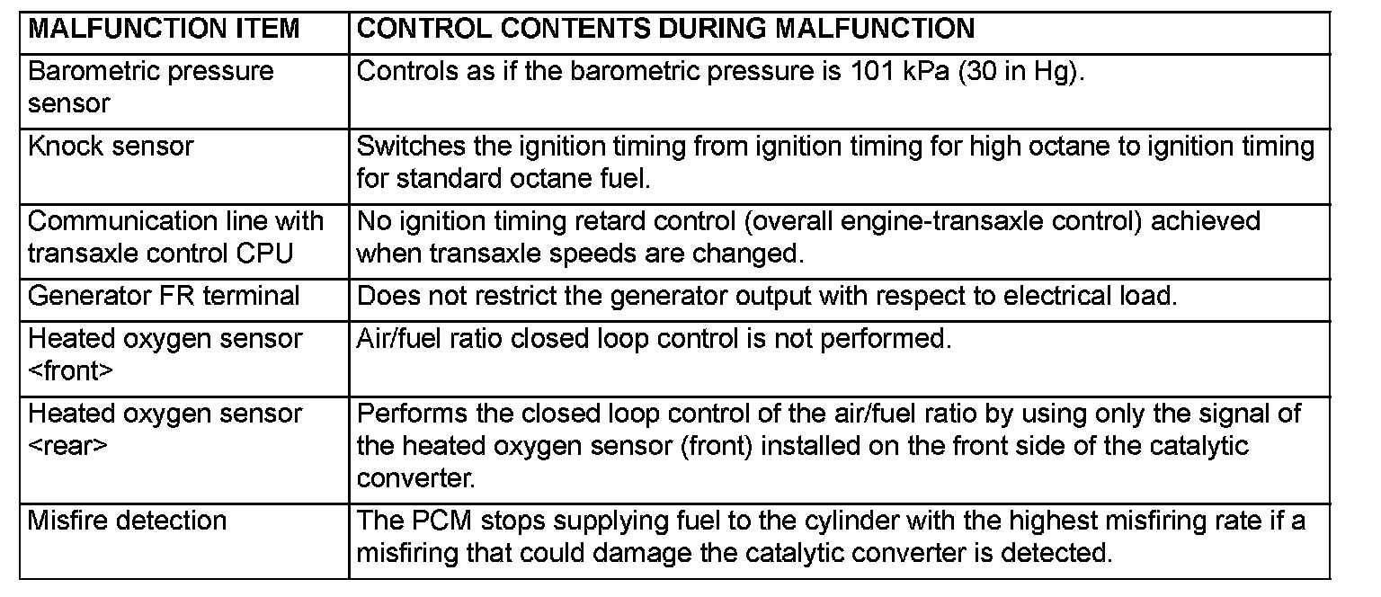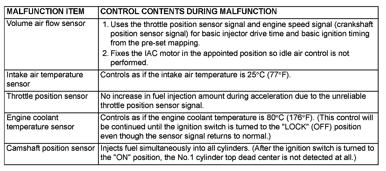 When the main sensor malfunctions are detected by the diagnostic test mode, the vehicle is controlled by means of the given defaults.