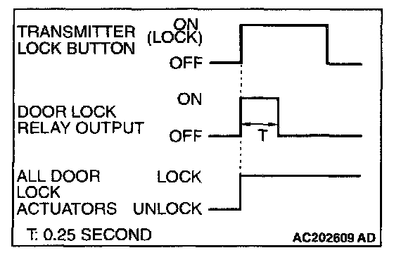 When the transmitter lock button is pressed, the ETACS-ECU energizes its door lock relay to operate all the door lock actuators for 0.25 second thus causing all doors to be locked.