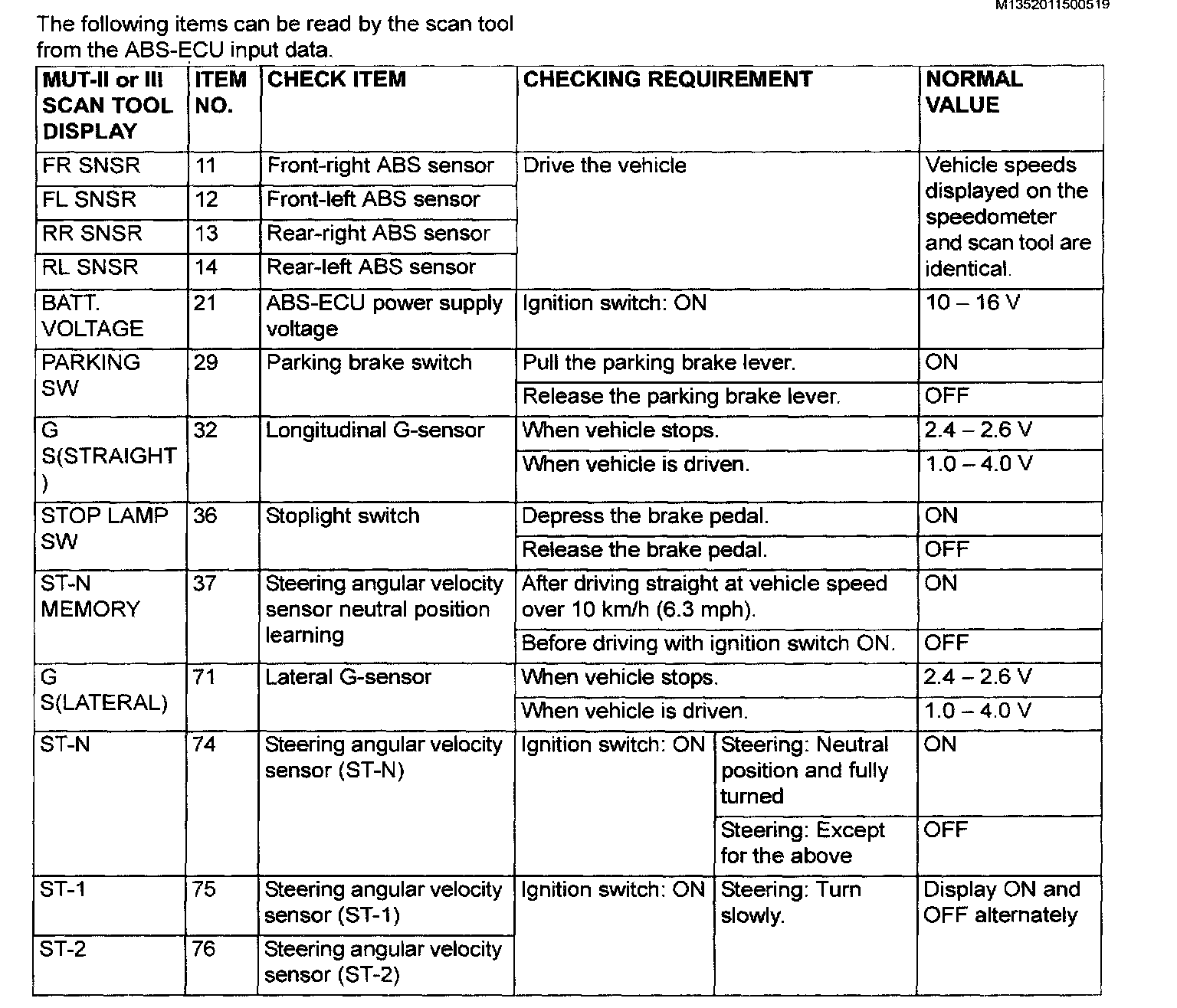 The following items can be read by the scan tool from the ABS-ECU input data.
