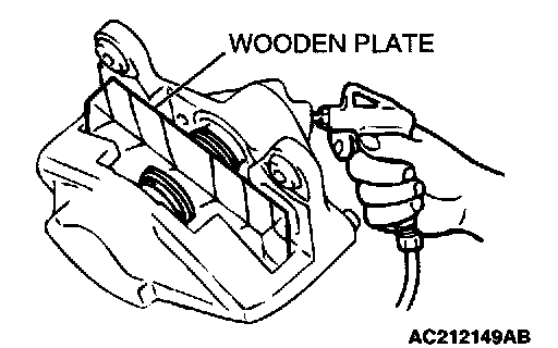 Remove the pistons by pumping in air slowly from the brake hose connection. Be sure to use a wood block and adjust the height of the two pistons while so that the pistons protrude evenly.