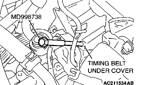 CAUTION: The special tool MD998738 can be gradually installed at a rate of a 30 degree turn per second. If it is screwed in all at once, the timing belt tensioner adjuster rod will not easily retract and the special tool MD998738 may bend.