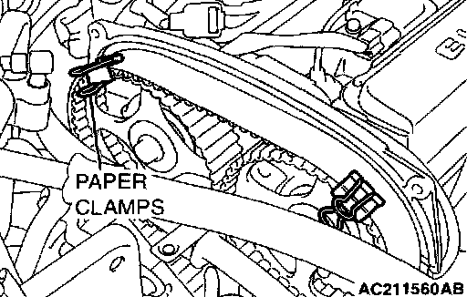 2. Pass the valve timing belt around the exhaust-side camshaft sprocket, and hold the valve timing belt with paper clamps.