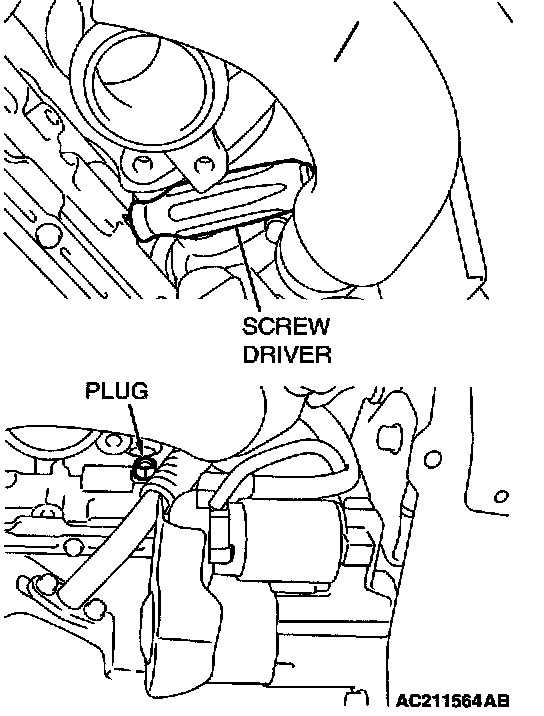 2. After aligning the timing marks of the engine oil pump sprocket, remove the cylinder block plug and insert a Phillips screw driver with a shaft diameter of 8 mm (0.31 inch) through the plug hole to check that the shaft of the screw driver can be inserted for 60 mm (2.36 inches) or more. If the screw driver makes contact with the balancer shaft and can be inserted for only 20 - 25 mm (0.79 - 0.98 inch), turn the engine oil pump sprocket for one round and align timing marks again to check that screw driver can be inserted for 60 mm or more. Do not take the screw driver out before completing installation of the valve timing belt.