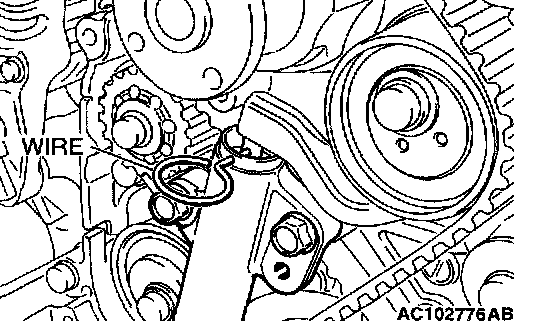 10. Insert wire or pin removed in Step 7 again, and ensure that it can be pulled out easily. When wire or pin can be easily removed, appropriate tension is applied on timing belt. In this case, remove wire or pin.