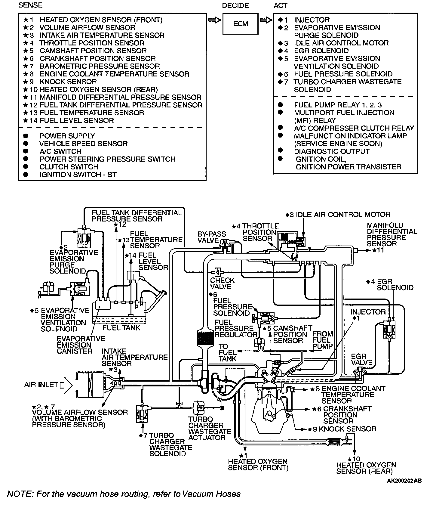 The Multiport Fuel Injection System consists of sensors, actuators and the engine control module (ECM). The sensors detect the engine condition. The module controls the system based on signals from these sensors. The actuators work under the control of the ECM. The ECM carries out activities such as fuel injection control, idle air control, and ignition timing control. In addition, the ECM is equipped with several diagnostic test modes which simplify troubleshooting when a problem develops.