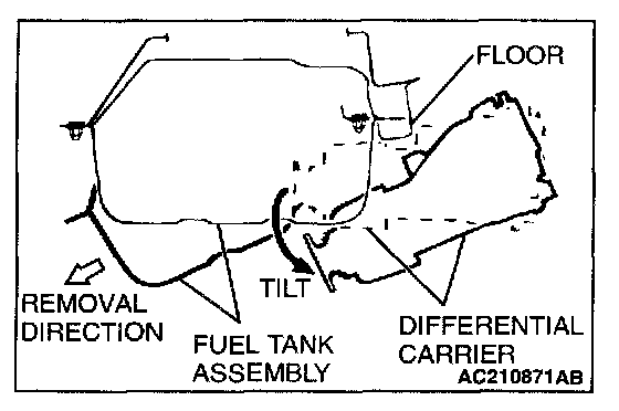 3. Remove the fuel tank assembly in the tilting direction to avoid contact with the differential carrier.