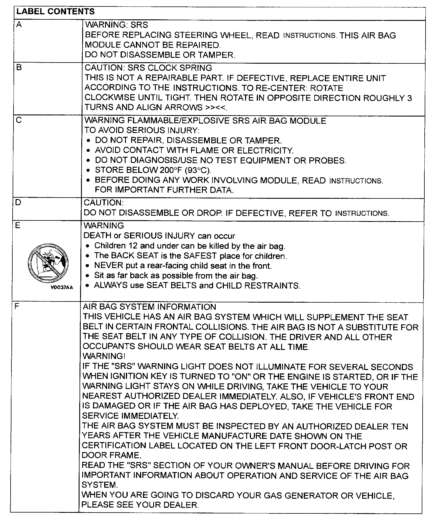 A number of caution labels related to the SRS are found in the vehicle, as shown in the illustration. Follow label instructions when servicing SRS. The label H is not to be removed except by owner. If the other labels are dirty or damaged, replace them.