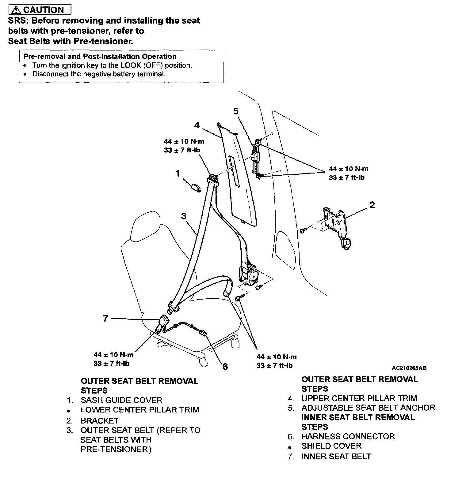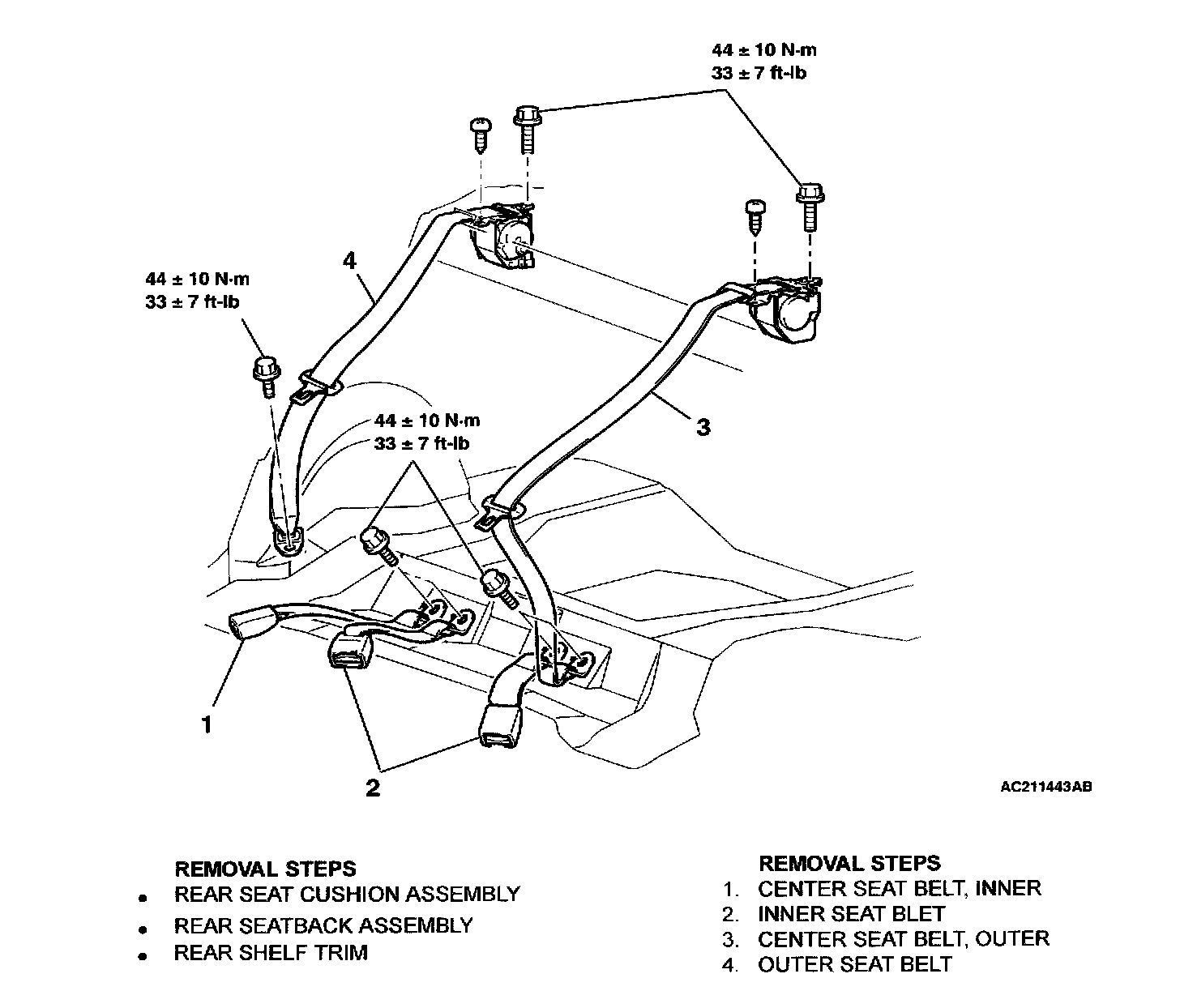 Center seat belt, outer bolt 44 ± 10 N.m (33 ± 7 ft-lb)