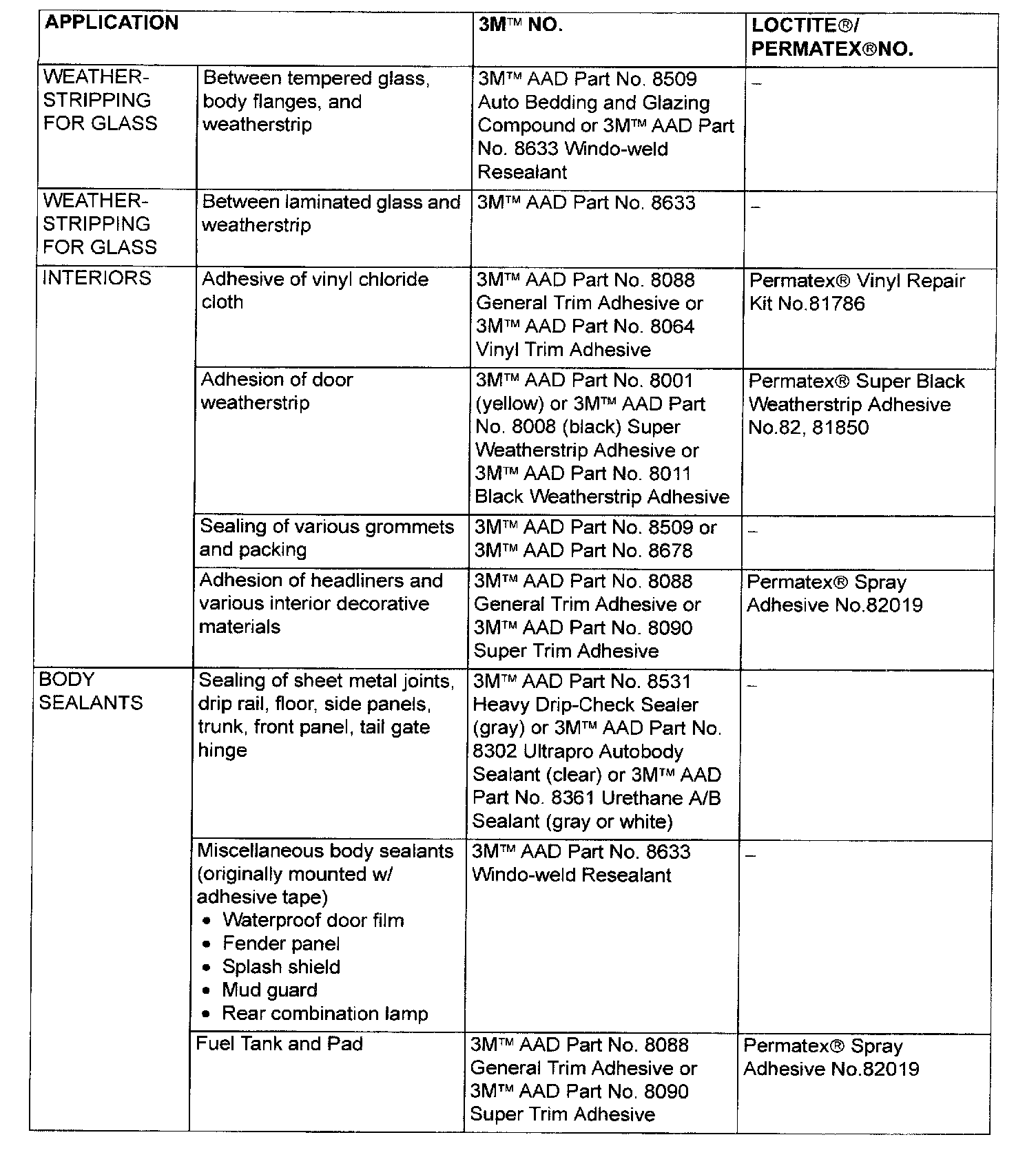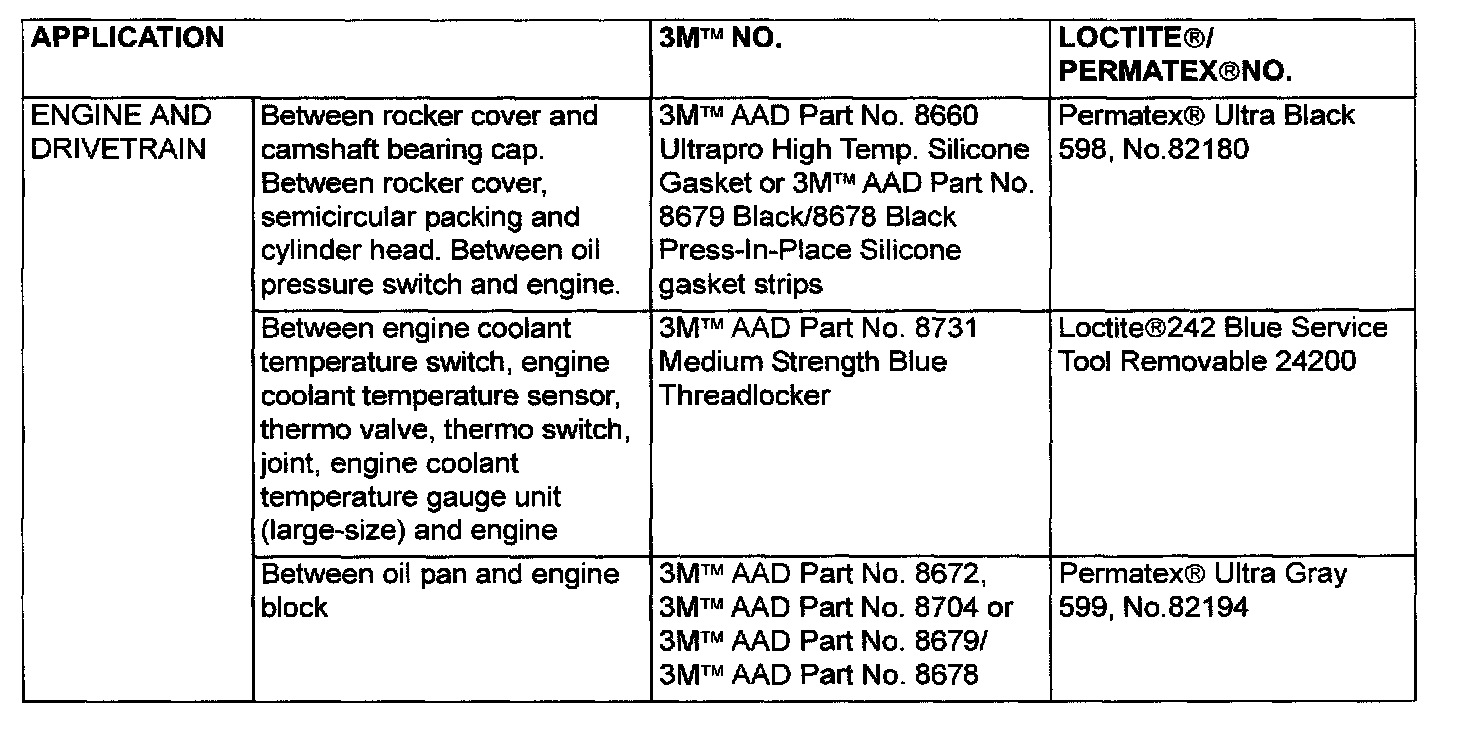 MAIN SEALANT AND ADHESIVE TABLE