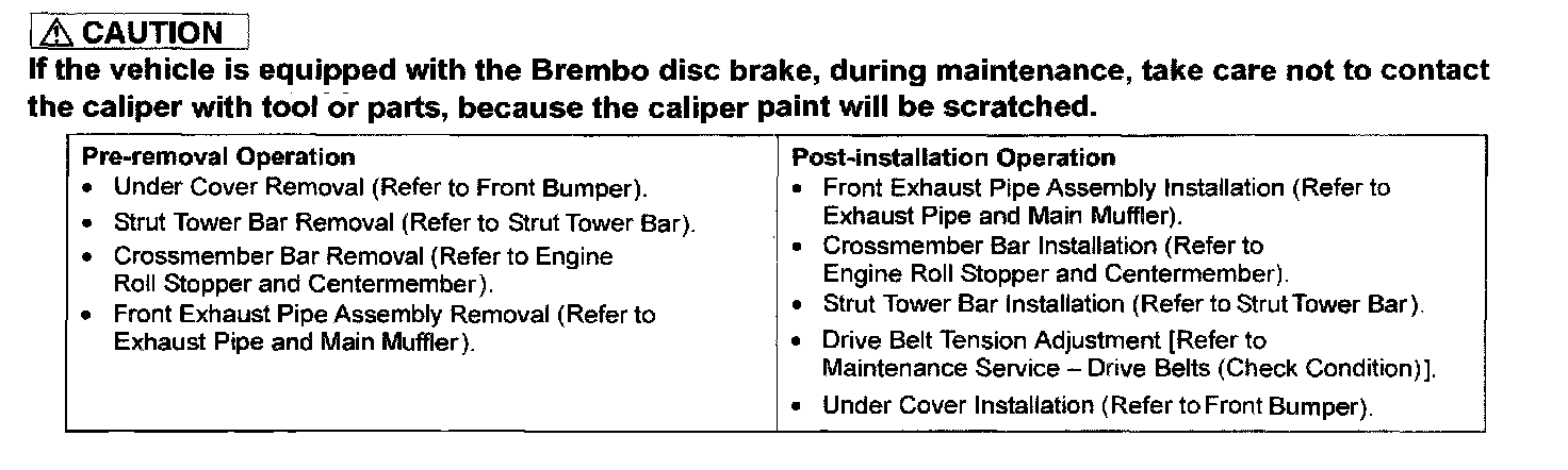 The following operations will be needed due to the serpentine drive system with the drive belt auto-tensioner.