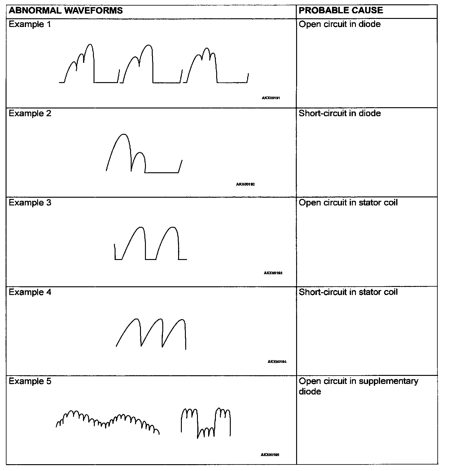 NOTE: Identification of abnormal waveforms is easier when there is a large output current (regulator is not operating). (Waveforms can be observed when the headlights are illuminated.)
