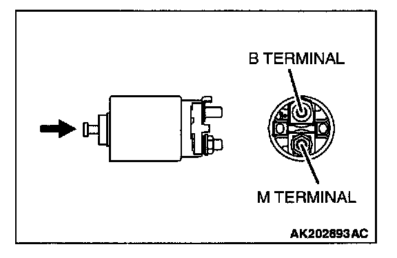 - Push the indicated end of the magnetic switch with a strong force to close the internal contacts. Without releasing the switch end, check that there is continuity between the B terminal and M terminal.