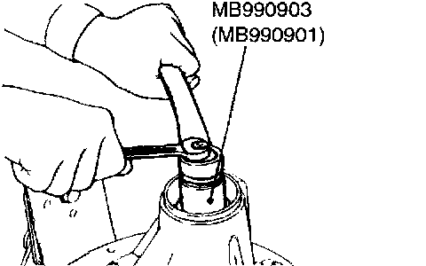 2. Install special tools MB990903 (MB990901) and MB991366 (MB991378), drive pinion front and rear bearing inner races to the differential carrier as shown in the illustration.