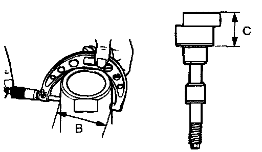 8. Use a micrometer to measure the shown dimensions (B, C) of special tools MB990392 and MB990836.