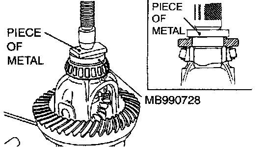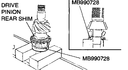 11. Fit the selected drive pinion rear shim(s) to the drive pinion, and press-fit the drive pinion rear bearing inner race by using special tool MB990728.