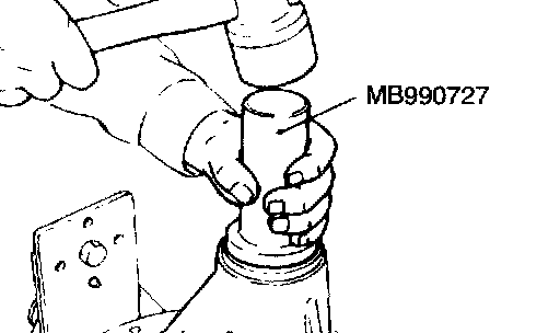 5. Remove the companion flange and drive pinion again. Then insert the drive pinion front bearing inner race into the differential carrier. Use special tool MB990727 to press-fit the drive pinion oil seal.