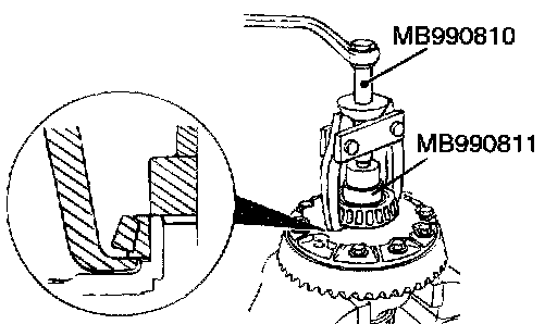 4. Remove the side bearing by using special tools MB990810 and MB990811.