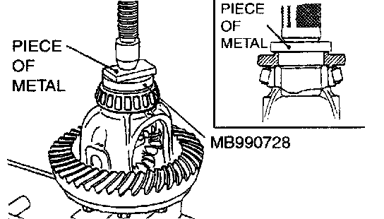 6. Use special tool MB990728 to press-fit the side bearing inner race into the limited slip differential case. After installing the outer race, assemble the limited slip differential case to the differential carrier.