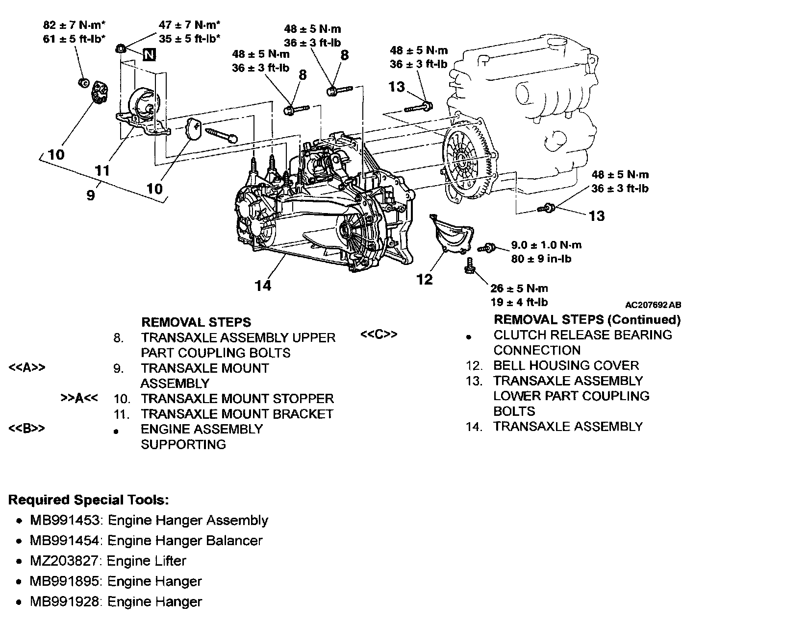 1) Set special tools MB991453 and MZ203827 to the vehicle to support the engine assembly.