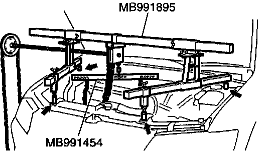1) Set special tool MB991895 to the strut mounting nuts and the radiator support upper insulator mounting bolts, which are located in the engine compartment, as shown.