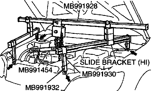 2) Set the engine hanger (special tool MB991928) to the strut mounting nuts and the radiator support upper insulator mounting bolts, which are located in the engine compartment, as shown.