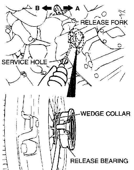 2. While pushing the release fork by hand in direction A, insert a flap-tip screwdriver between the release bearing and the wedge collar.