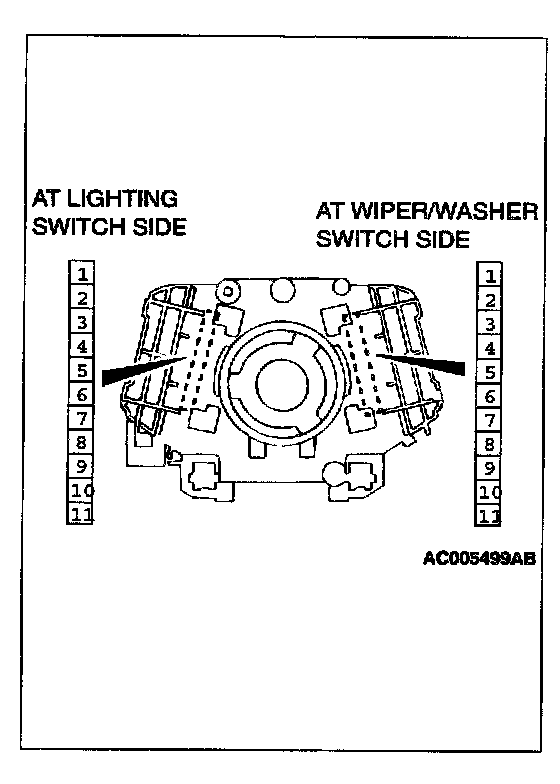 2. Among individual connectors of the column switch body remaining in the steering column, check for continuity between same number terminals (No.3-11).