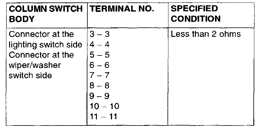 COLUMN SWITCH CONTINUITY CHECK (AT SWITCH BODY)1. Remove the lighting switch and the wiper/washer switch.