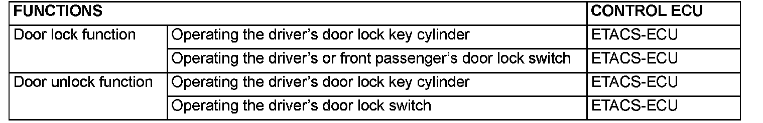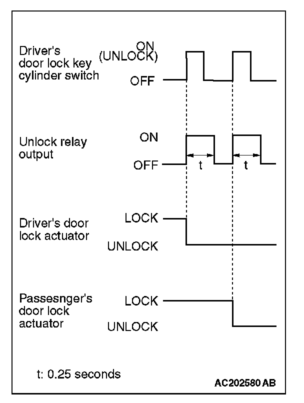 When the door is unlocked by driver's or front passenger's door lock switch, the ETACS-ECU energizes its door unlock relay for 0.25 second to activate all the door lock actuators. Then all the doors will be unlocked.