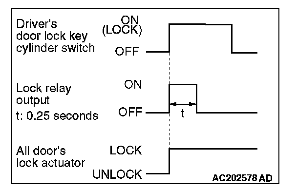 When you insert the ignition key to the driver's door lock key cylinder and turn the key clockwise to lock the door, the ETACS-ECU energizes its door lock relay for 0.25 second to activate all the door lock actuators. Then all the doors will be locked.