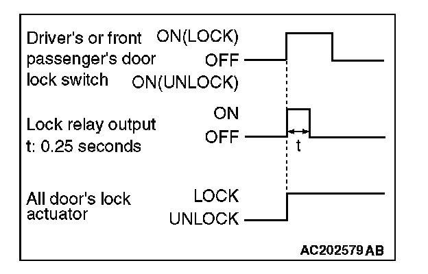 When the door is locked by driver's or front passenger's door lock switch, the ETACS-ECU energizes its door lock relay for 0.25 second to activate all the door lock actuators. Then all the doors will be locked.