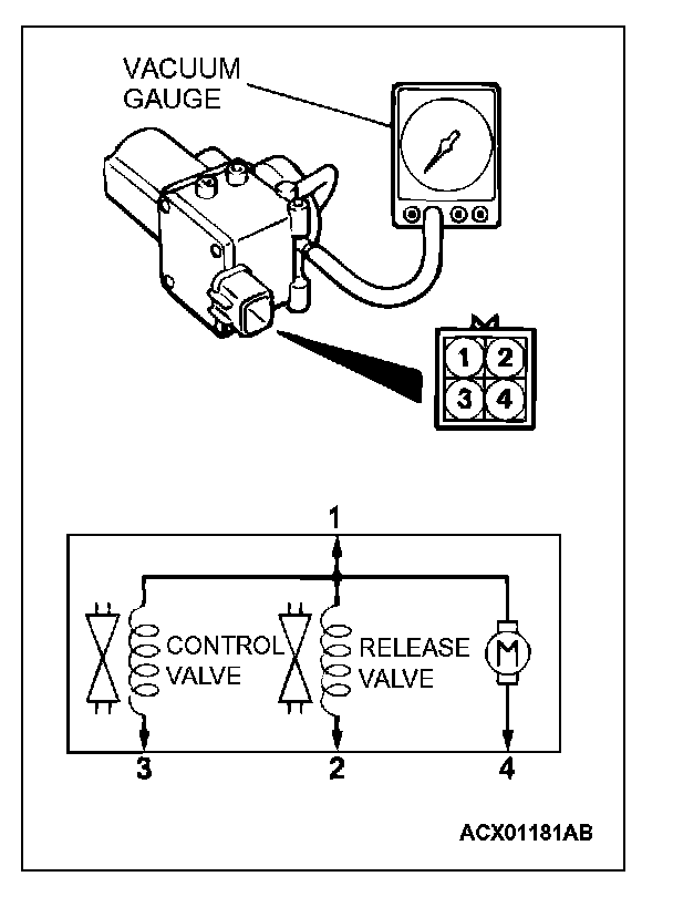 1. Connect the positive battery terminal to auto-cruise vacuum pump connector terminal 1, and the negative battery terminal to terminals 2, 3, and 4. Then the vacuum gauge should read 27 kPa (8.0 in Hg) or more.