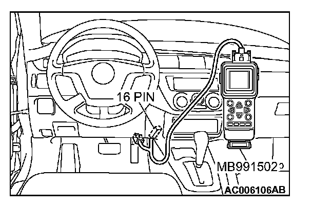 CAUTION: To prevent damage to scan tool MB991502, always turn the ignition switch to the "LOCK" (OFF) position before connecting or disconnecting scan tool MB991502.
