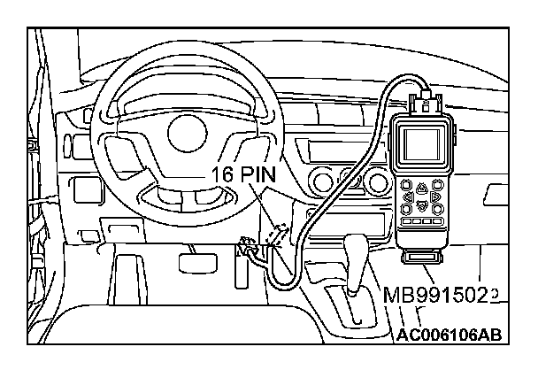 CAUTION: To prevent damage to scan tool MB991502, always turn the ignition switch to the "LOCK" (OFF) position before connecting or disconnecting scan tool MB991502.
