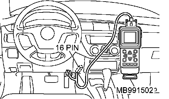 CAUTION: To prevent damage to scan tool MB991502, always turn the ignition switch to the "LOCK" (OFF) position before connecting or disconnecting scan tool MB991502.