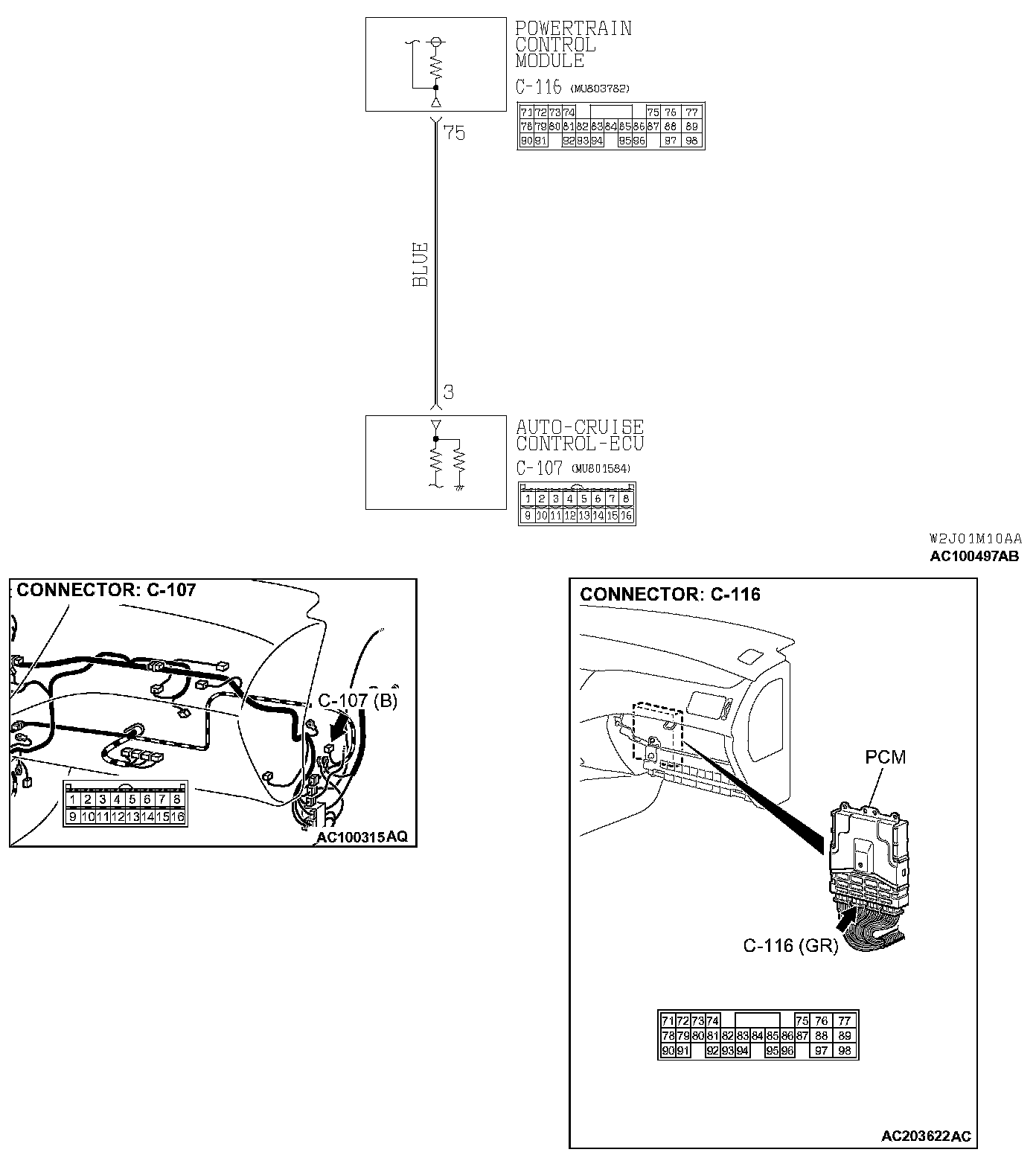 STEP 5. Check the harness for open circuit, short circuit to ground or damage between PCM connector C-116 terminal 75 and auto-cruise control-ECU connector C-107 terminal 3.