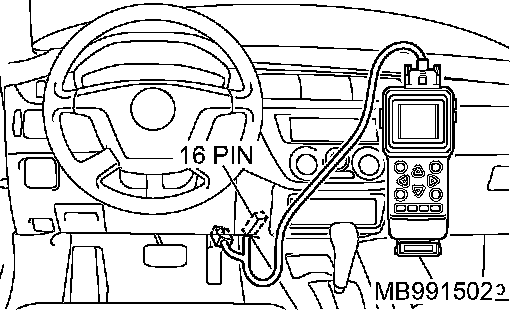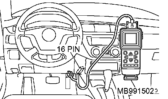 CAUTION: To prevent damage to scan tool MB991502, always turn the ignition switch to the "LOCK" (OFF) position before connecting or disconnecting scan tool MB991502.