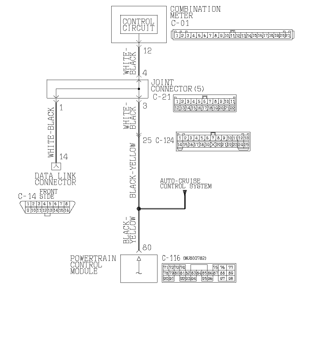 STEP 6. Check the harness for open circuit, short circuit to ground or damage between combination meter connector C-01 terminal 12 and PCM connector C-116 terminal 80.