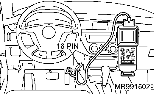 CAUTION: To prevent damage to scan tool MB991502, always turn the ignition switch to the "LOCK" (OFF) position before connecting or disconnecting scan tool MB991502.
