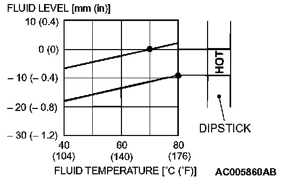 NOTE: If it takes some amount of time until the A/T fluid reaches its normal operating temperature [70 - 80°C (158 - 176°F)], check the A/T fluid level by referring to the left diagram.