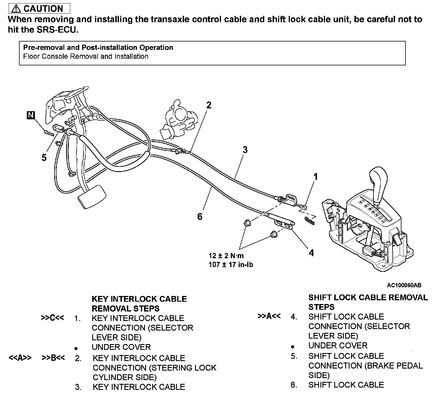 CAUTION: When removing and installing the transaxle control cable and shift lock cable unit, be careful not to hit the SRS-ECU.