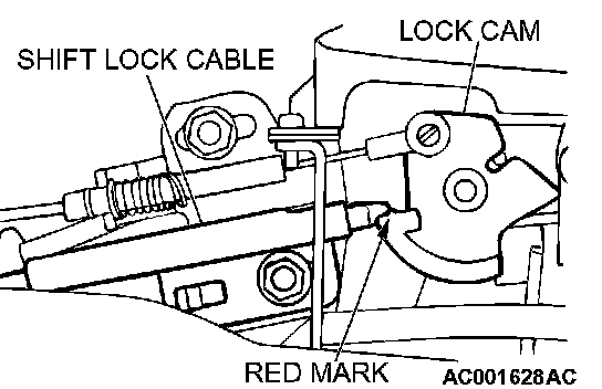 2. Fasten the shift lock cable at the position where the end of the shift lock cable is positioned above the red marking on the lock cam.
