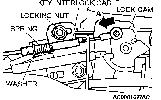 4. Lightly push the key interlock cable into the key interlock cable housing toward the arrow (A) direction until the cable movement stops and the cable end eye is aligned with the shaft on the lock cam. Tighten the locking nut. Snap the cable end eye onto the shaft of the lock cam.